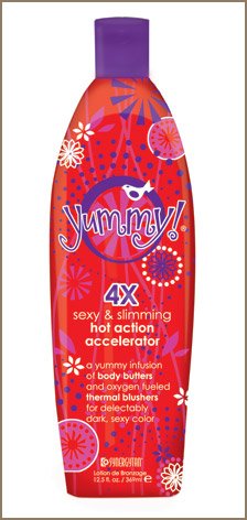 2009 Synergy Tan Yummy 4xSexy & Slimming Hot Action Accelerator 12.5 oz4X Sexy & Slimming Hot Action AcceleratorA super Yummy infusion of creamy, moisturizing Body Butters, oxygen fueled Thermal Hot Action and powerful Tanning Accelerators melt into your skin for delectably dark, sexy color. Intense skin redding indicates the skin surface is being supplied with more oxygen and vital nutrients for increased dark tanning performance. * A proprietary blend of Dark Tanning Accelerators delivers faster, longer lasting and intense dark tanning results. * Thermal Blushers increase microcirculation and bring oxygen to the skin surface for intense hot action results. * Exotic Florals slim & trim while combating environmental stress and skin damage. * Hydrating and deeply conditioning exotic Acacia, Kiwi, Shea and Cocoa Butters melt into skin for intensely rich moisture. * Aloe Vera deeply heals, soothes, repairs and moisturizes skin. * Endorphin Boosters increase feeling of happiness and relaxation by boosting the body's natural B-endorphins. * PARABEN FREEFragrance: Yummy Mango, Passion Fruit and Sultry Orange